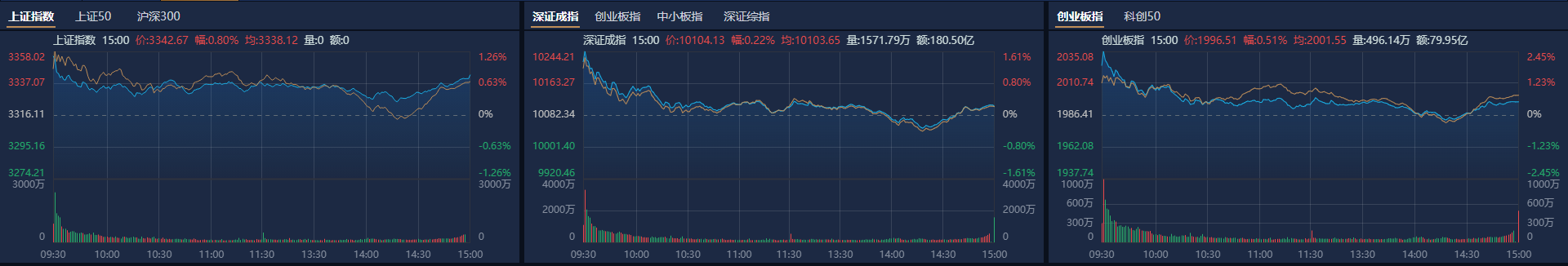 市场全天高开后震荡回落,三大指数小幅上涨。南财金融终端显示,截至收盘,沪指涨0.8%,深成指涨0.22%,创业板指涨0.51%。