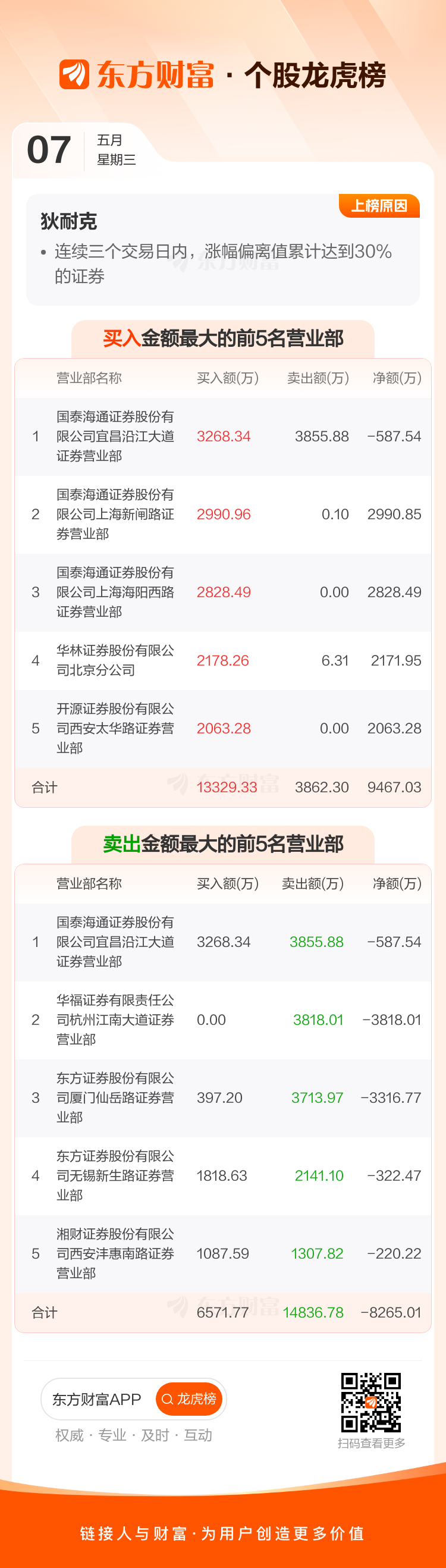 交易所2025年5月7日公布的交易公开信息显示,狄耐克因成为连续三个交易日内,涨幅偏离值累计达到30%的证券上榜。狄耐克当日收报14.63元,涨跌幅20.02%,换手率20.07%,成交额5.61亿。异常期间5月6日至5月7日,期间涨幅44.00%,累计偏离值40.65%,区间成交额7.57亿。