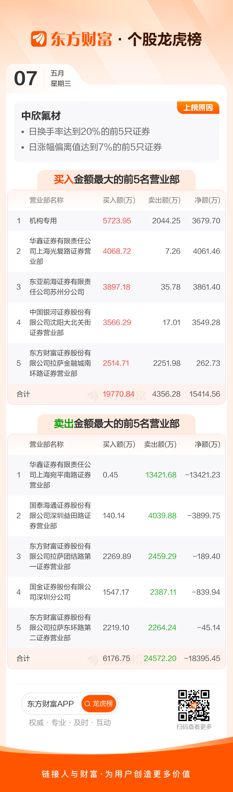 交易所2025年5月7日公布的交易公开信息显示,中欣氟材因成为日换手率达到20%的前5只证券、日涨幅偏离值达到7%的前5只证券上榜。中欣氟材当日收报23.57元,涨跌幅9.99%,偏离值41.96%,换手率41.92%,成交额26.92亿。