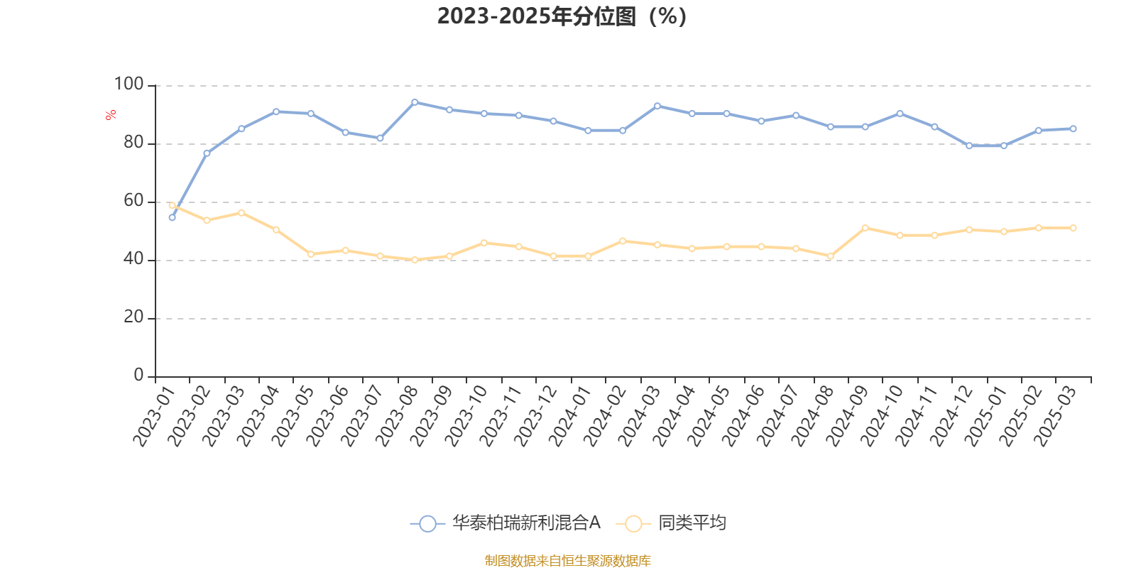 通过所选区间该基金净值增长率分位图,可以观察该基金与同类基金业绩比较情况。图为坐标原点到区间内某时点的净值增长率在同类基金中的分位数。