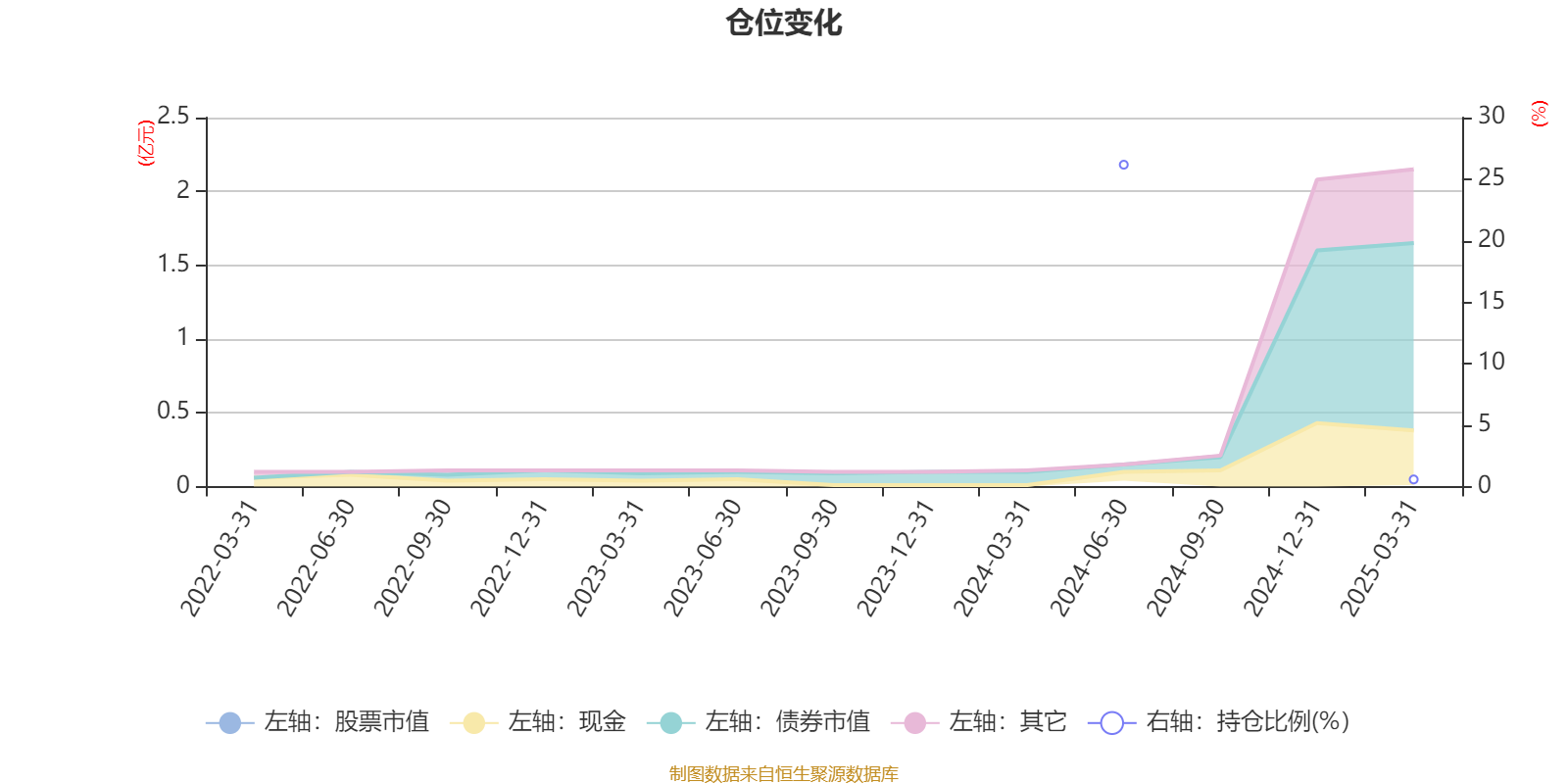 据定期报告数据统计,成立以来平均股票仓位为13.38%,同类平均为18.87%。2024年上半年末基金达到26.17%的最高仓位,2025年一季度末最低,为0.58%。