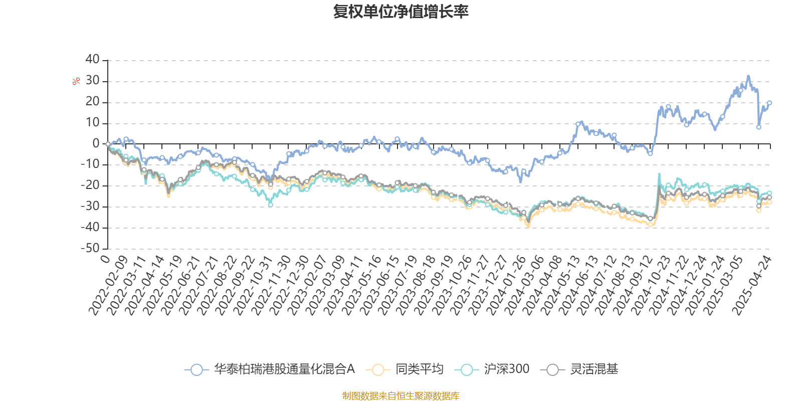 截至4月24日,华泰柏瑞港股通量化混合A近三个月复权单位净值增长率为5.80%,位于同类可比基金84/918;近半年复权单位净值增长率为2.75%,位于同类可比基金225/918;近一年复权单位净值增长率为20.48%,位于同类可比基金93/918;近三年复权单位净值增长率为29.19%,位于同类可比基金25/901。