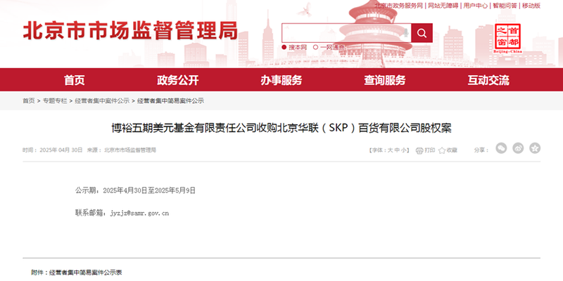 近日,北京市市场监督管理局公示称,博裕五期美元基金有限责任公司(下称“博裕基金”)通过其关联方拟收购北京华联(SKP)百货有限公司(下称“北京SKP”)部分股权。交易完成后,博裕基金关联方通过财务投资间接取得北京SKP42%-45%的股权。