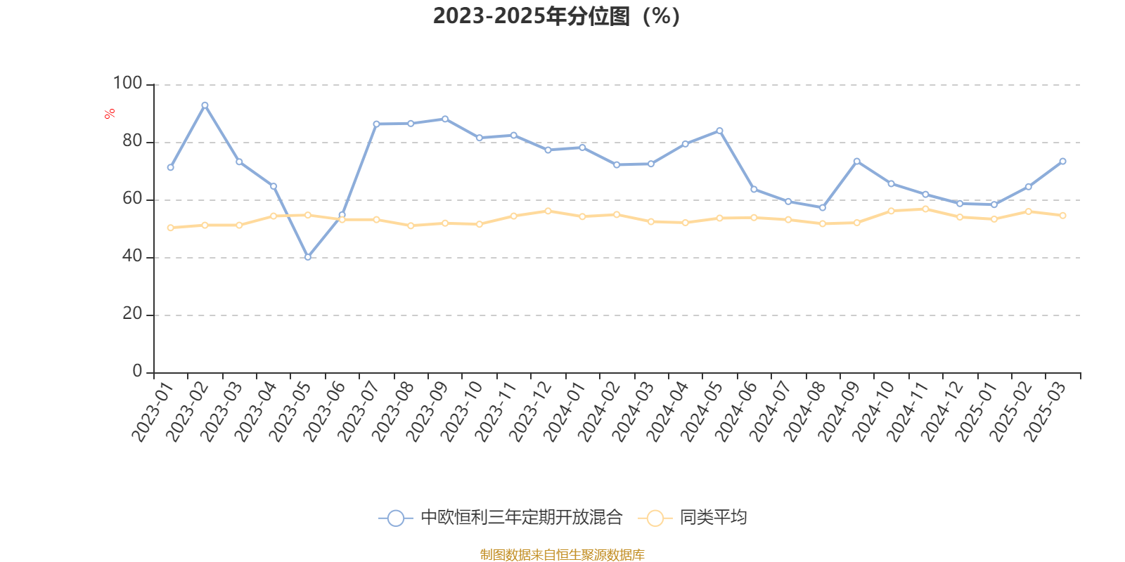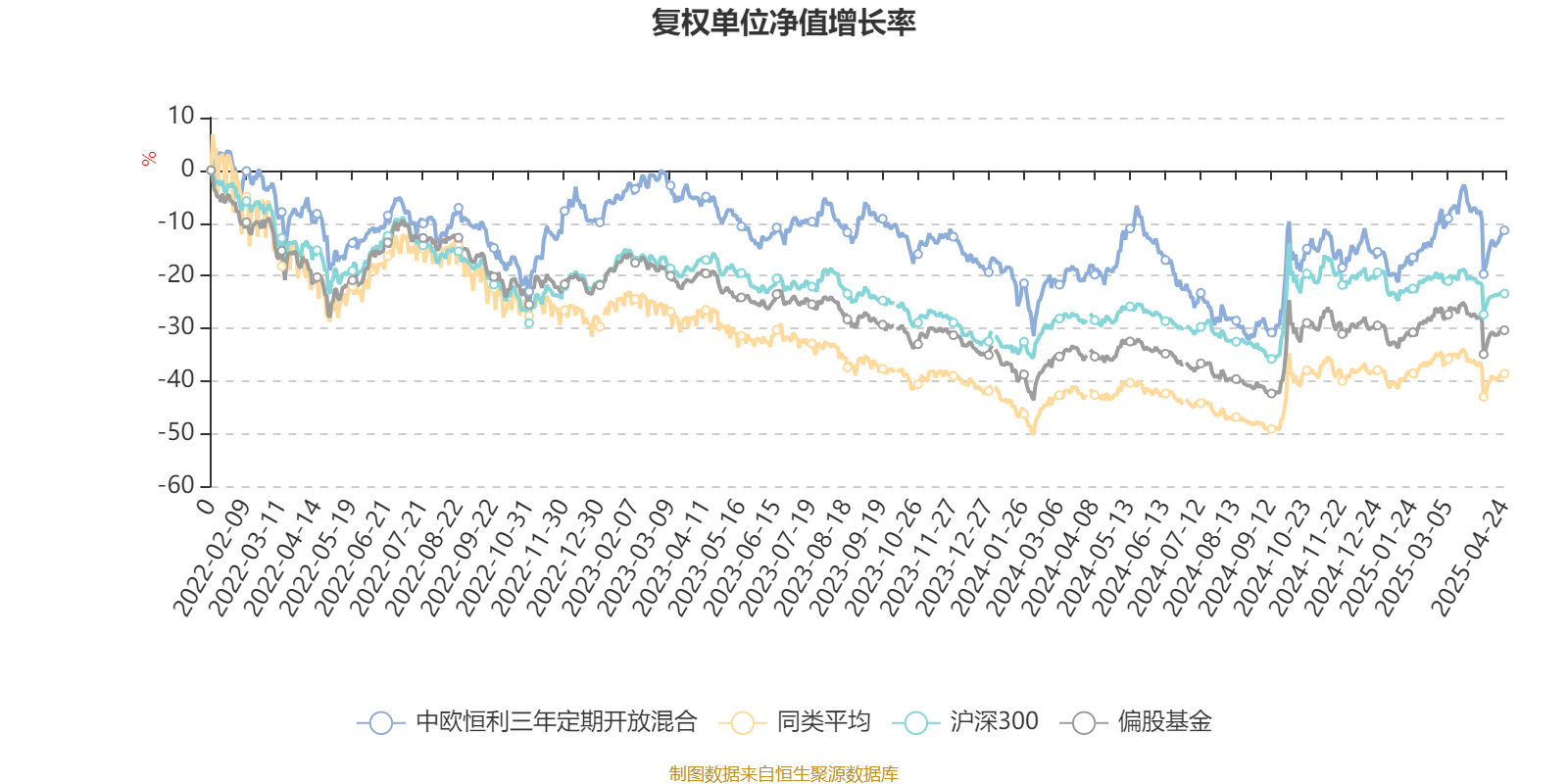 截至4月24日,中欧恒利三年定期开放混合近三个月复权单位净值增长率为6.15%,位于同类可比基金90/646;近半年复权单位净值增长率为5.37%,位于同类可比基金140/646;近一年复权单位净值增长率为8.57%,位于同类可比基金299/642;近三年复权单位净值增长率为1.10%,位于同类可比基金139/494。