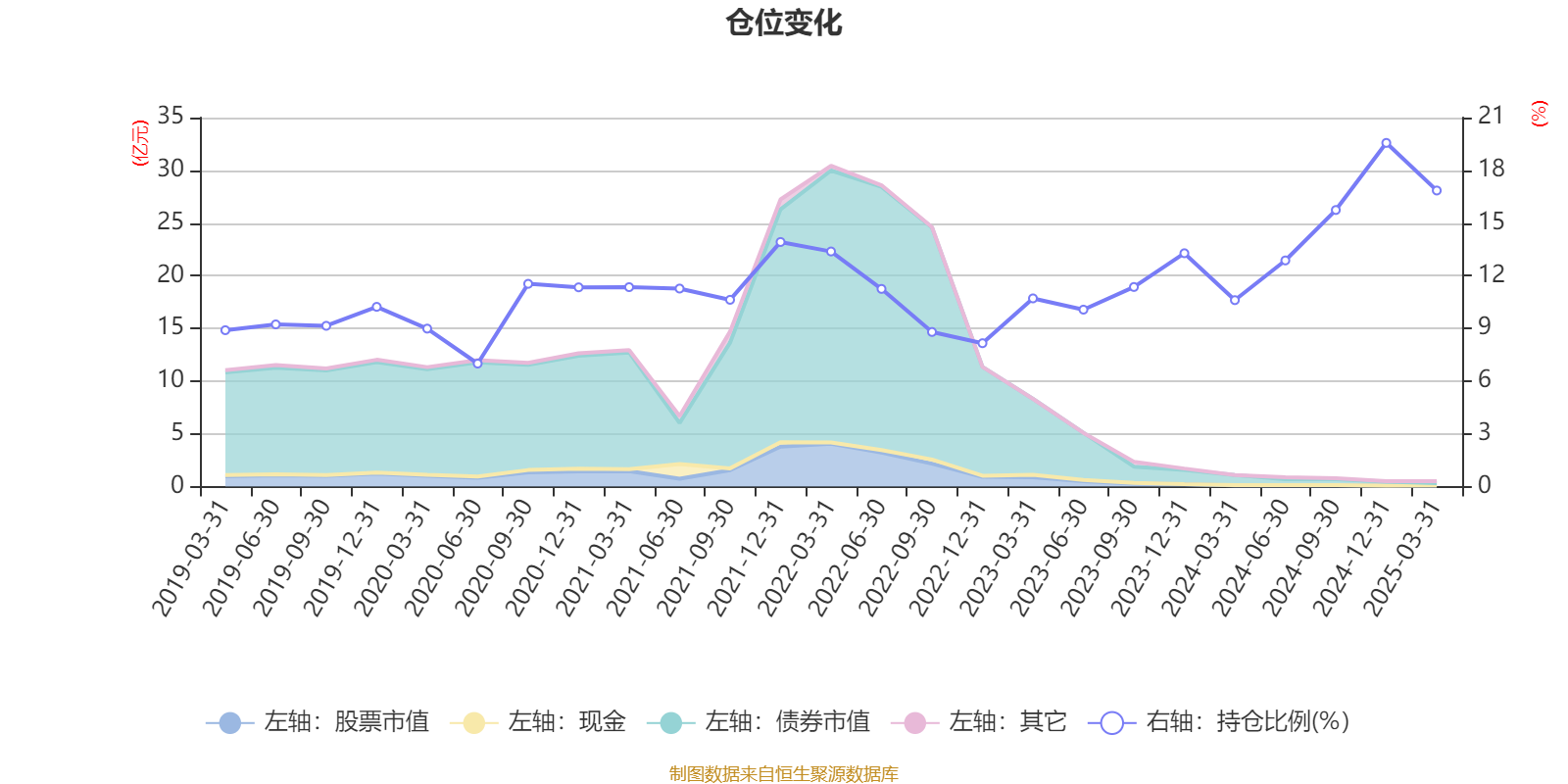 据定期报告数据统计,近三年平均股票仓位为12.44%,同类平均为18.87%。2024年末基金达到19.56%的最高仓位,2020年上半年末最低,为7%。