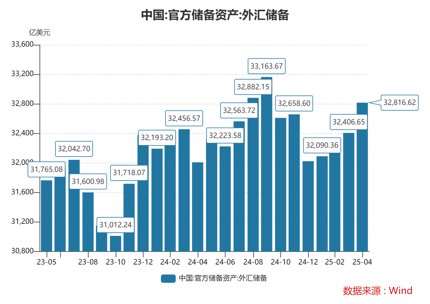 5月7日,国家外汇管理局统计数据显示,截至2025年4月末,我国外汇储备规模为32817亿美元,较3月末上升410亿美元,升幅为1.27%。