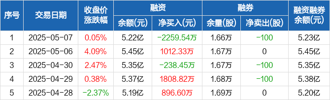 融资方面,当日融资买入3442.99万元,融资偿还5702.53万元,融资净偿还2259.54万元。融券方面,融券卖出0股,融券偿还100股,融券余量1.66万股,融券余额32.95万元。融资融券余额合计5.23亿元。