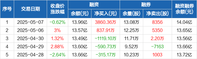 融资方面,当日融资买入1.16亿元,融资偿还7708.88万元,融资净买入3860.36万元。融券方面,融券卖出9790股,融券偿还1434股,融券余量13.08万股,融券余额834.7万元。融资融券余额合计14.04亿元。