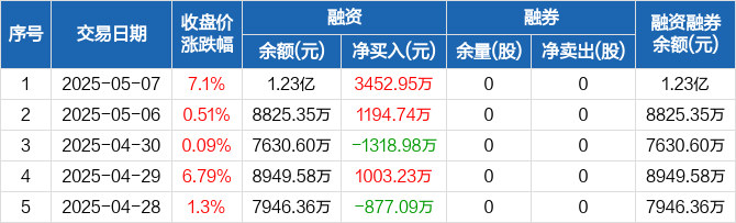 融资方面,当日融资买入8609.47万元,融资偿还5156.52万元,融资净买入3452.95万元,净买入额创历史新高。融券方面,融券卖出0股,融券偿还0股,融券余量0股,融券余额0元。融资融券余额合计1.23亿元。