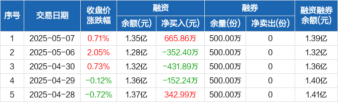 融资方面,当日融资买入1295.06万元,融资偿还629.2万元,融资净买入665.86万元。融券方面,融券卖出0份,融券偿还0份,融券余量500万份,融券余额426万元。融资融券余额合计1.39亿元。
