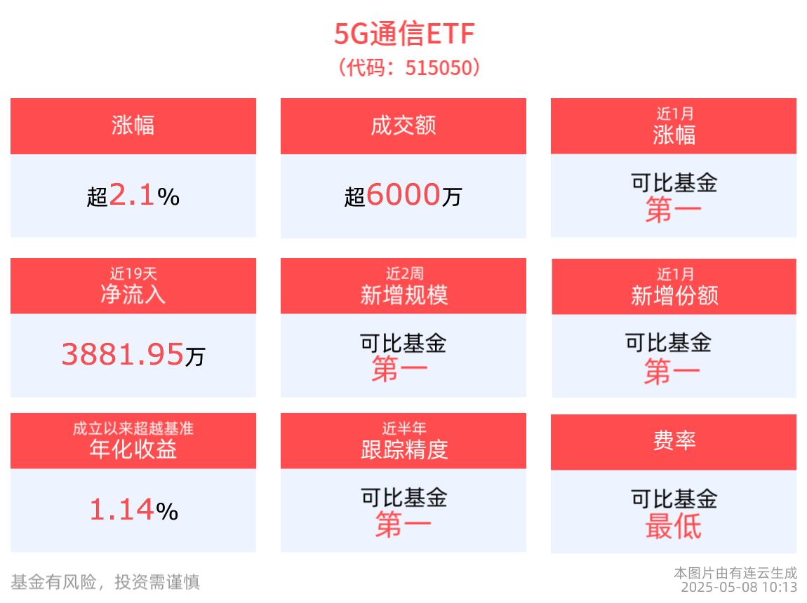 跟踪精度方面,截至2025年5月7日,5G通信ETF近半年跟踪误差为0.018%,在可比基金中跟踪精度最高。