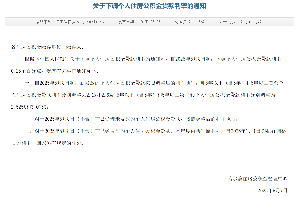 上证报中国证券网讯(记者田甜)5月7日晚,哈尔滨住房公积金管理中心发布了《关于下调个人住房公积金贷款利率的通知》,自2025年5月8日起,下调个人住房公积金贷款利率0.25个百分点。