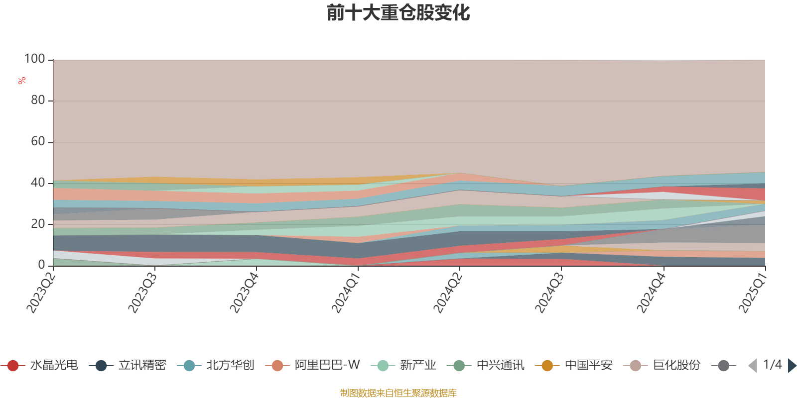 截至2025年一季度末,基金十大重仓股分别是小米集团-W、中芯国际、晶晨股份、金蝶国际、巨化股份、立讯精密、阿里巴巴-W、高伟电子、腾讯控股、比亚迪股份。