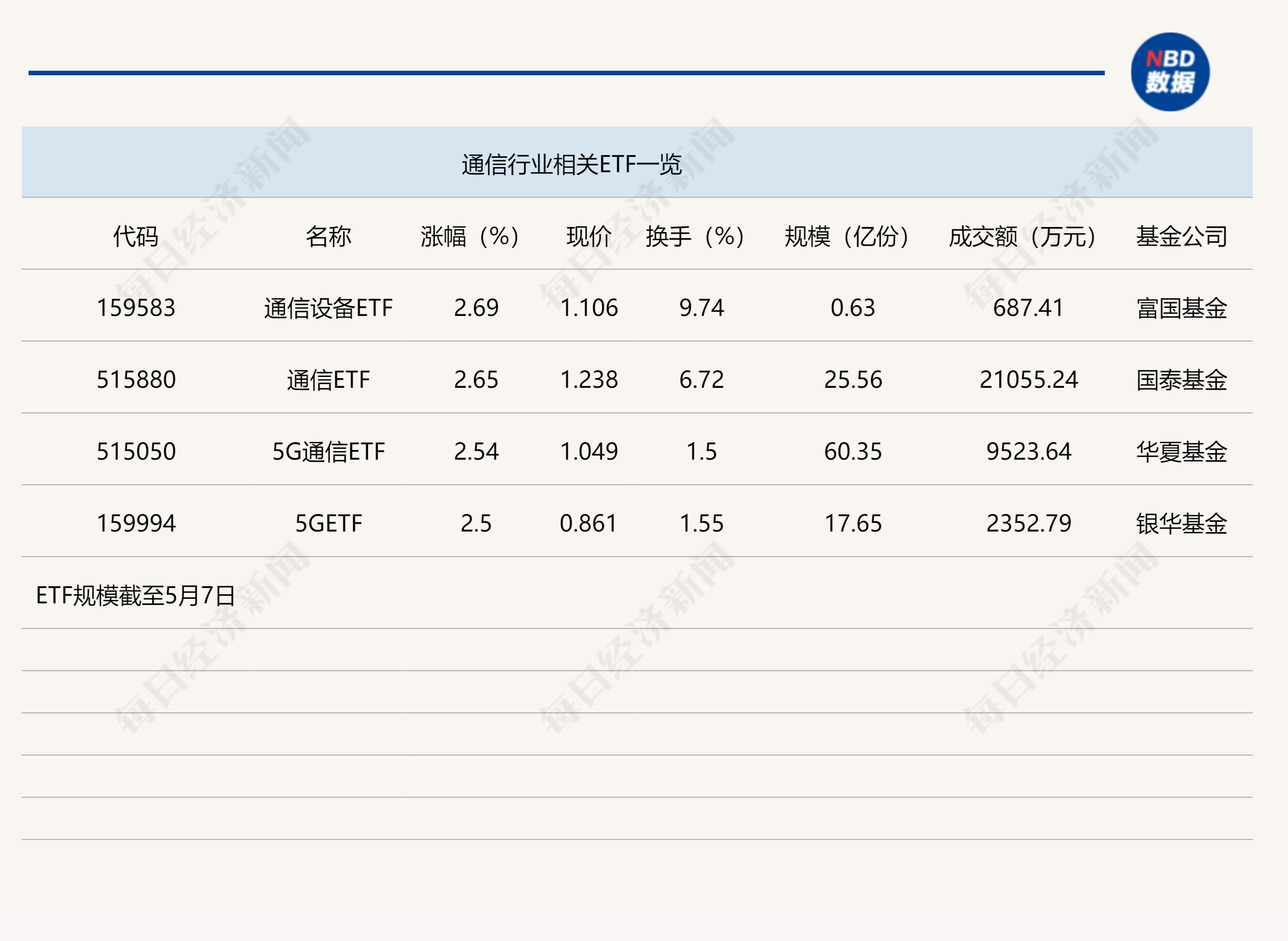 点评:通信ETF(515880)今日上午大涨2.65%,其规模为25.56亿份,半日成交金额为2.11亿元,交投相对活跃,该ETF追踪的是中证全指通信设备指数。