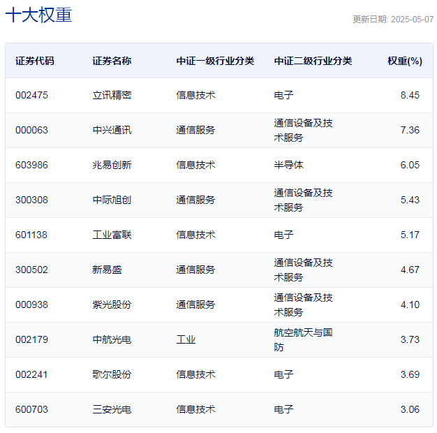 中证全指通信设备指数从中证全指样本股中按中证行业分类方法选出通信设备行业股票。前十大权重股涵盖了大量5G概念股,指数历史表现优异,成长性高。