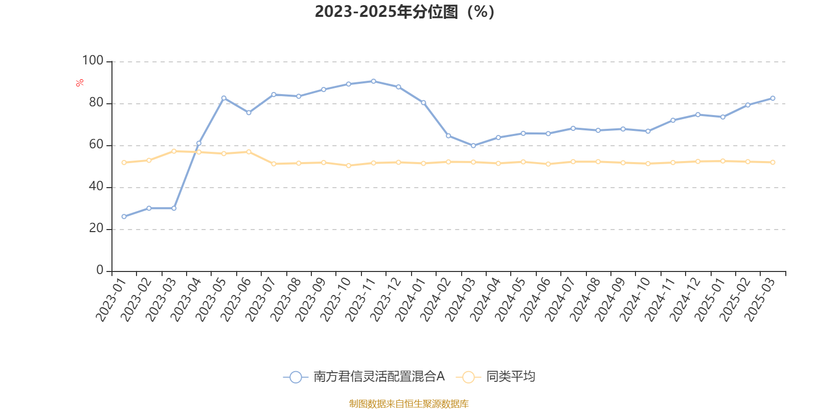 通过所选区间该基金净值增长率分位图,可以观察该基金与同类基金业绩比较情况。图为坐标原点到区间内某时点的净值增长率在同类基金中的分位数。