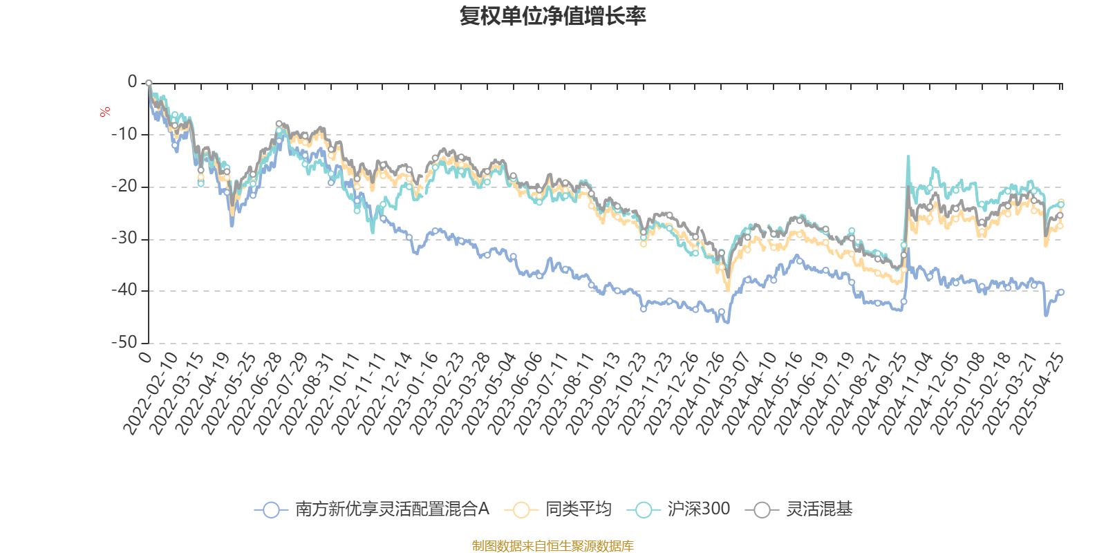 截至4月25日,南方新优享灵活配置混合A近三个月复权单位净值增长率为-3.40%,位于同类可比基金682/959;近半年复权单位净值增长率为-6.85%,位于同类可比基金776/959;近一年复权单位净值增长率为-5.60%,位于同类可比基金842/957;近三年复权单位净值增长率为-17.33%,位于同类可比基金714/939。