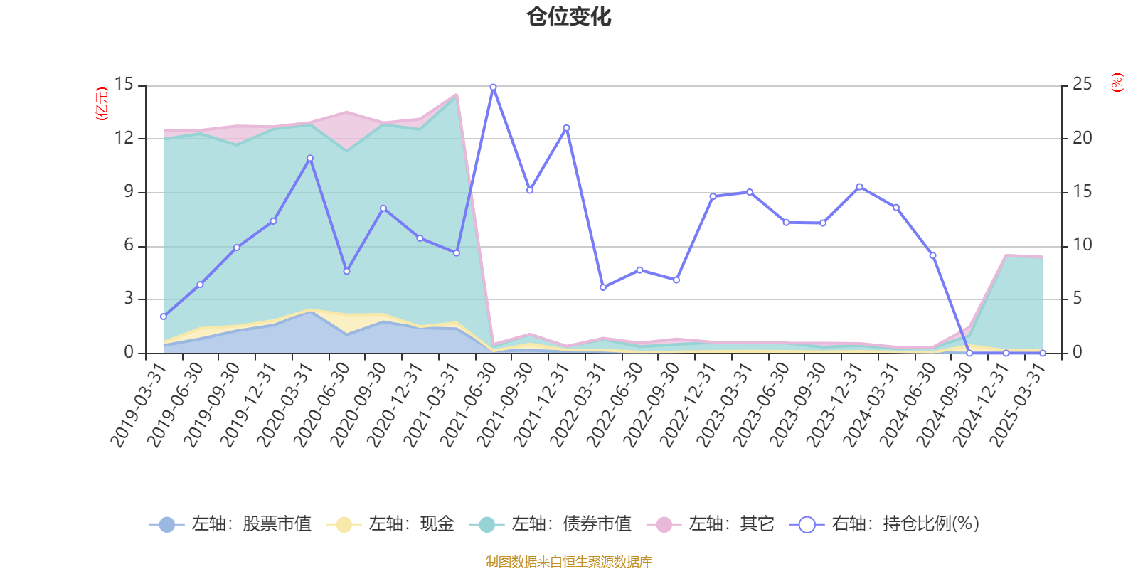 据定期报告数据统计,近三年平均股票仓位为8.91%,同类平均为18.94%。2021年上半年末基金达到24.83%的最高仓位,2019年一季度末最低,为3.42%。
