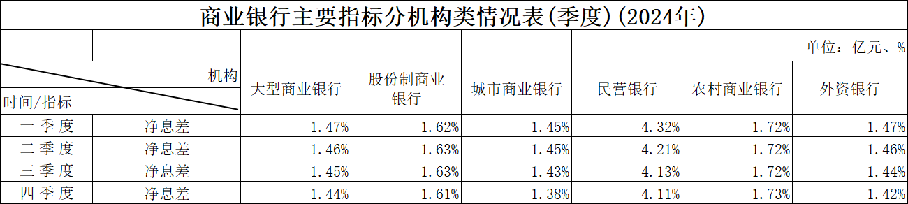 国家金融监督管理局披露的数据显示,从2024年一季度到四季度各个报告期末,民营银行整体净息差水平分别为4.32%、4.21%、4.13%、4.11%逐季递减。