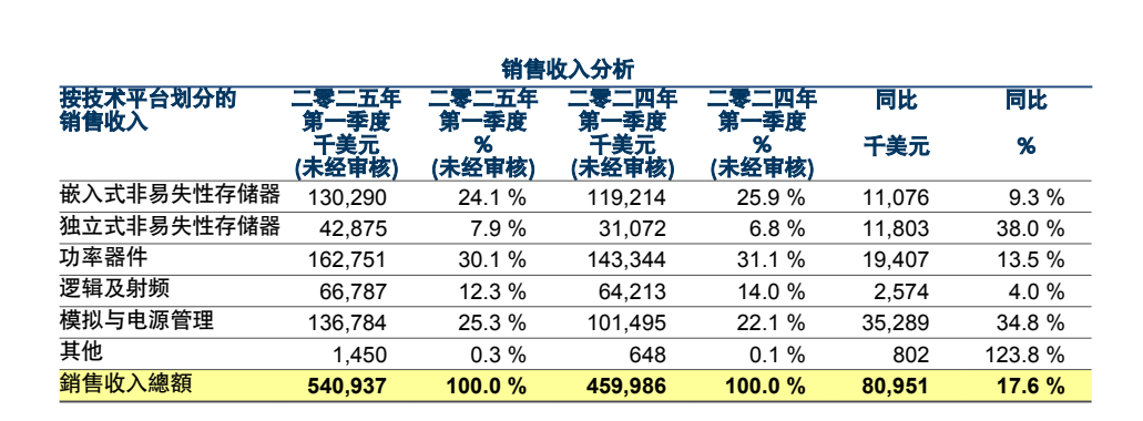 公司表示,2025年第一季度销售收入、毛利率均符合指引。整体业绩延续了2024年以来的趋势,销售收入稳步成长,产品结构持续优化,产能利用率保持满载。净利润下降主要由于研发投入增加、所得税抵免减少及外币汇兑损失上升,部分被毛利上升所抵消。