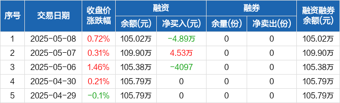 融资方面,当日融资买入173.56万元,融资偿还178.44万元,融资净偿还4.89万元。融券方面,融券卖出0份,融券偿还0份,融券余量0份,融券余额0元。融资融券余额合计105.02万元。