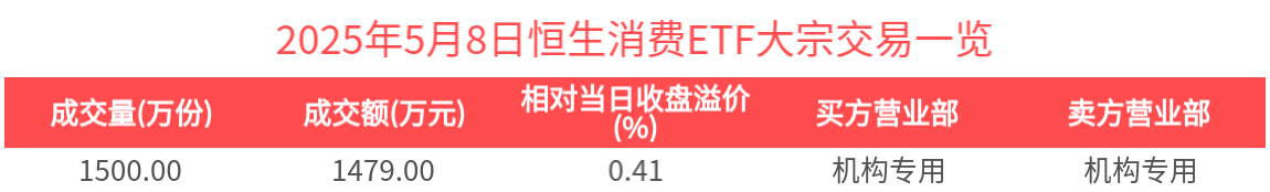 2025年5月8日,恒生消费ETF(159699.SZ)收跌0.30%,发生1笔溢价大宗交易,成交价为0.99元,较当日收盘价溢价0.41%。成交额为1479.00万元,居全市场第一。