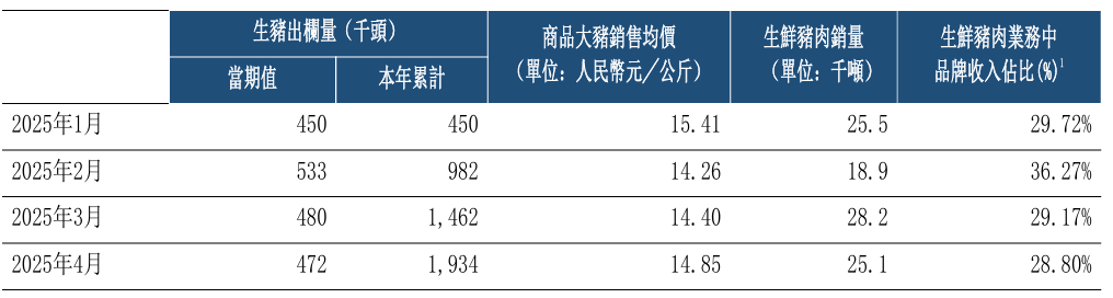 5月9日,中粮家佳康(01610)发布公告,披露了2025年4月的主要运营数据。根据公告,本公司及其附属公司在2025年4月的生猪出栏量为47万头,商品大猪销售均价为14.85元/公斤,生鲜猪肉销量为2.5万吨,生鲜猪肉业务中品牌收入占比为28.80%。