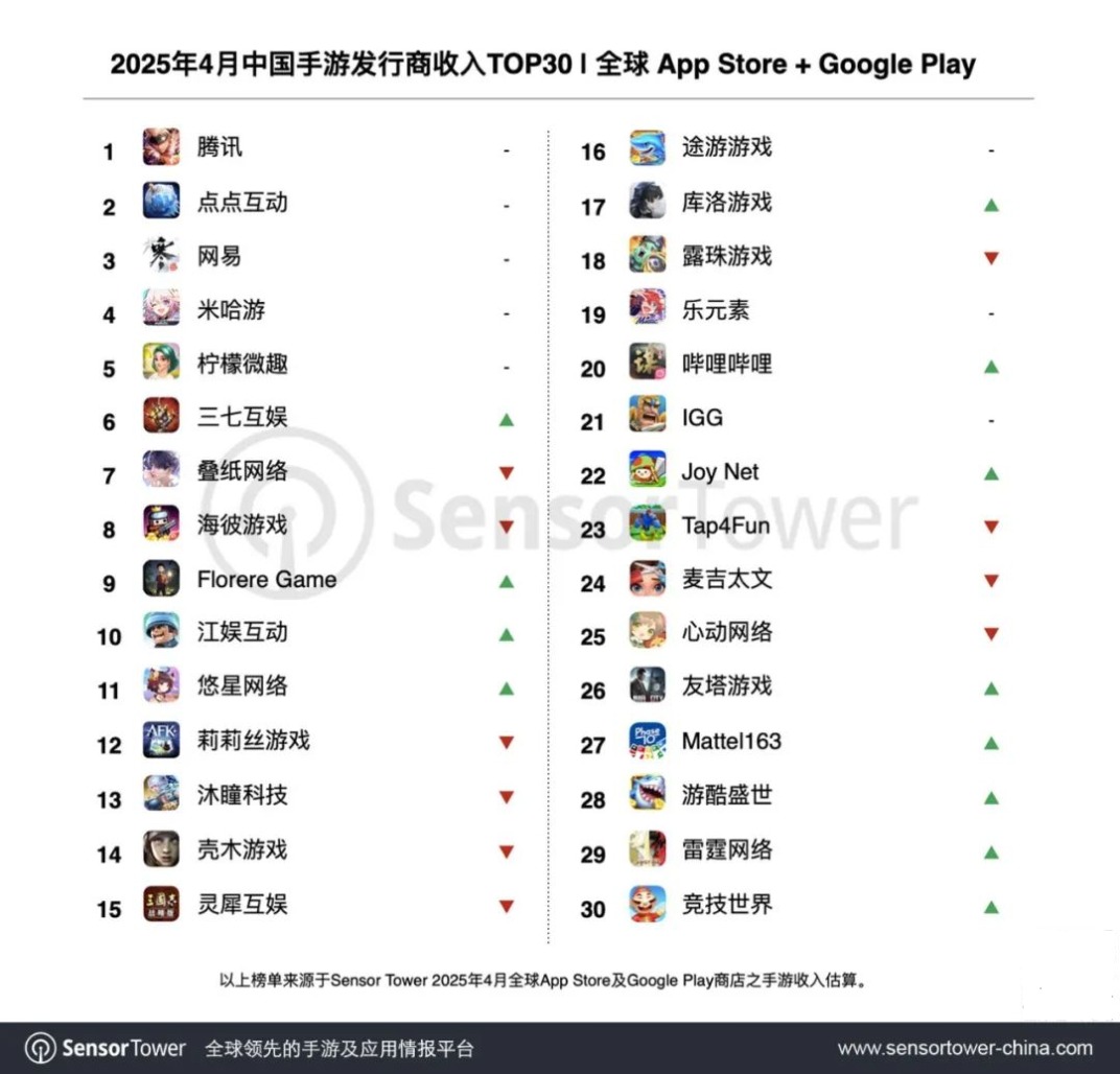 近日,移动应用市场研究机构Sensor Tower发布2025年4月中国手游厂商全球收入榜单。腾讯(00700)、ST华通(002602)旗下点点互动、网易(09999)、米哈游及柠檬微趣五家厂商稳居收入榜前五,头部效应持续强化。