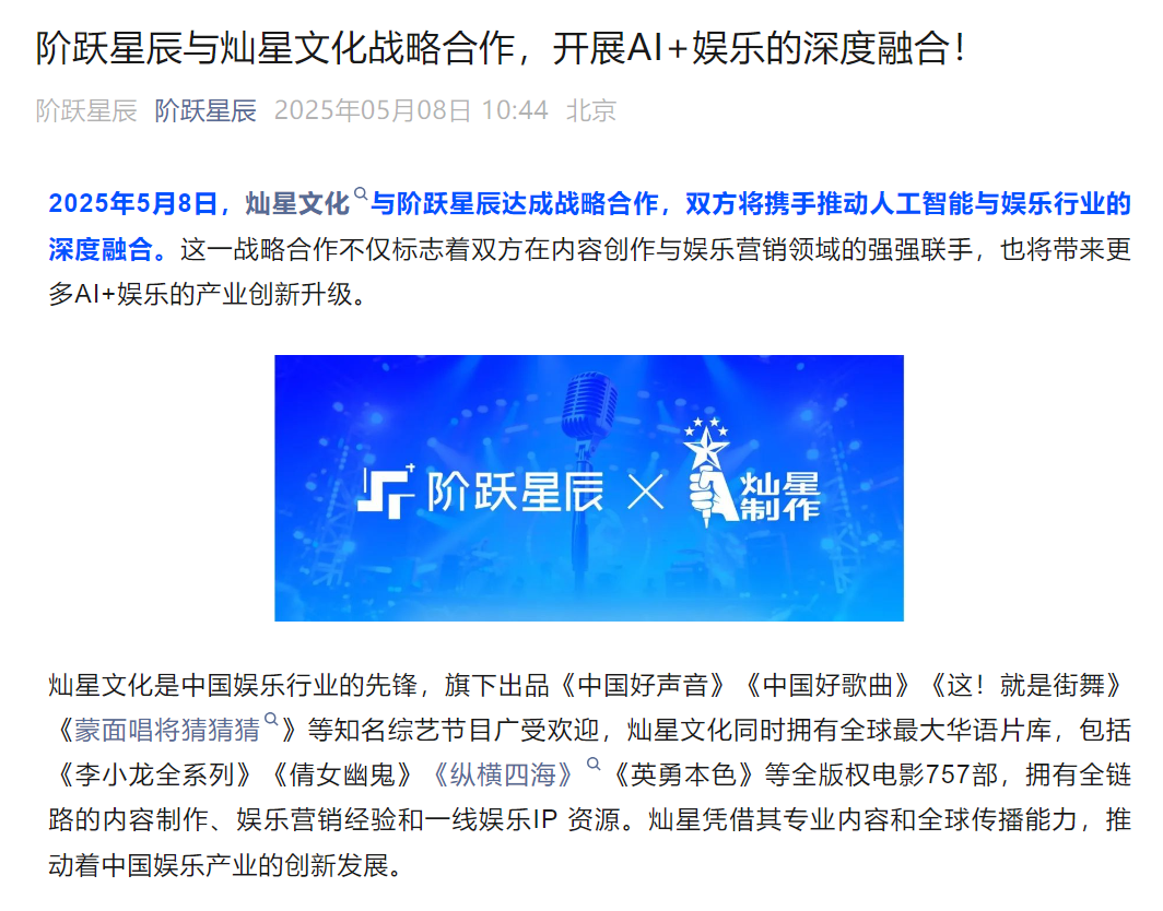 每经AI快讯,2025年5月8日,灿星文化与阶跃星辰达成战略合作,双方将携手推动人工智能与娱乐行业的深度融合。这一战略合作不仅标志着双方在内容创作与娱乐营销领域的强强联手,也将带来更多AI+娱乐的产业创新升级。