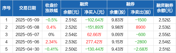 融资方面,当日融资买入510.58万元,融资偿还613.22万元,融资净偿还102.64万元。融券方面,融券卖出0股,融券偿还1500股,融券余量9.83万股,融券余额98.79万元。融资融券余额合计2.52亿元。