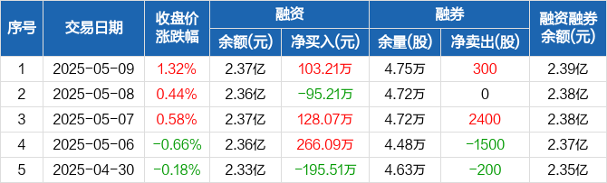 融资方面,当日融资买入372.87万元,融资偿还269.67万元,融资净买入103.21万元。融券方面,融券卖出300股,融券偿还0股,融券余量4.75万股,融券余额109.16万元。融资融券余额合计2.39亿元。
