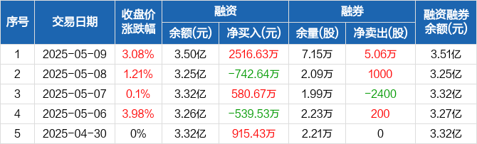 融资方面,当日融资买入8314.96万元,融资偿还5798.34万元,融资净买入2516.63万元。融券方面,融券卖出5.06万股,融券偿还0股,融券余量7.15万股,融券余额74.15万元。融资融券余额合计3.51亿元。