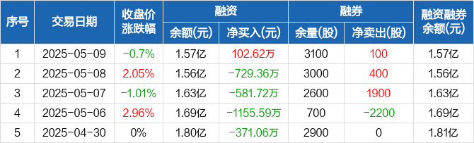 融资方面,当日融资买入1322.38万元,融资偿还1219.76万元,融资净买入102.62万元。融券方面,融券卖出200股,融券偿还100股,融券余量3100股,融券余额15.36万元。融资融券余额合计1.57亿元。