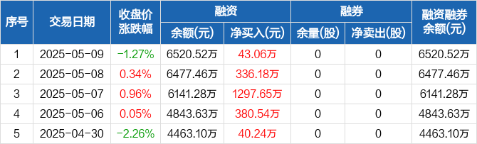 融资方面,当日融资买入187.16万元,融资偿还144.09万元,融资净买入43.06万元,连续6日净买入累计3332.75万元。融券方面,融券卖出0股,融券偿还0股,融券余量0股,融券余额0元。融资融券余额合计6520.52万元。