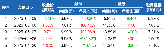 融资方面,当日融资买入1014.56万元,融资偿还1464.92万元,融资净偿还450.36万元。融券方面,融券卖出600股,融券偿还8.5万股,融券余量5.89万股,融券余额59.31万元。融资融券余额合计6.97亿元。
