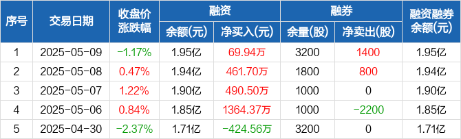 融资方面,当日融资买入671.57万元,融资偿还601.62万元,融资净买入69.94万元,连续4日净买入累计2386.52万元。融券方面,融券卖出1400股,融券偿还0股,融券余量3200股,融券余额8.14万元。融资融券余额合计1.95亿元。