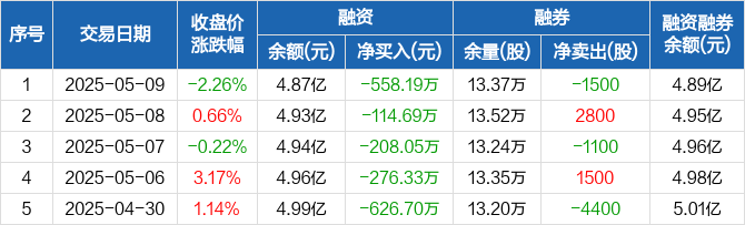 融资方面,当日融资买入1201.35万元,融资偿还1759.54万元,融资净偿还558.19万元,连续7日净偿还累计4282.54万元。融券方面,融券卖出0股,融券偿还1500股,融券余量13.37万股,融券余额179.56万元。融资融券余额合计4.89亿元。