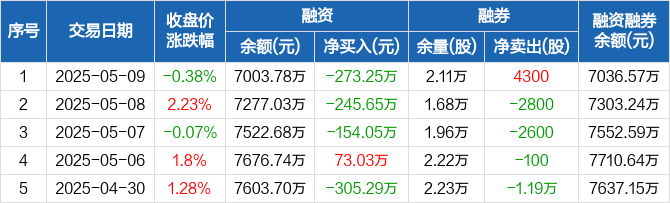融资方面,当日融资买入131.19万元,融资偿还404.45万元,融资净偿还273.25万元,连续3日净偿还累计672.96万元。融券方面,融券卖出4300股,融券偿还0股,融券余量2.11万股,融券余额32.79万元。融资融券余额合计7036.57万元。