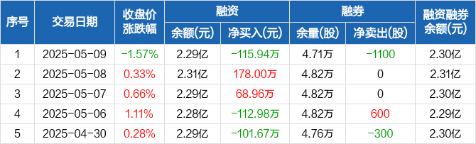 融资方面,当日融资买入676.53万元,融资偿还792.47万元,融资净偿还115.94万元。融券方面,融券卖出0股,融券偿还1100股,融券余量4.71万股,融券余额85.58万元。融资融券余额合计2.3亿元。