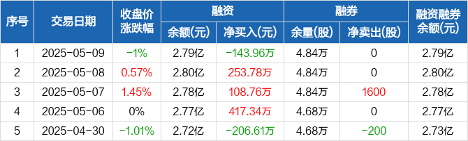 融资方面,当日融资买入255.77万元,融资偿还399.73万元,融资净偿还143.96万元。融券方面,融券卖出0股,融券偿还0股,融券余量4.84万股,融券余额33.64万元。融资融券余额合计2.79亿元。