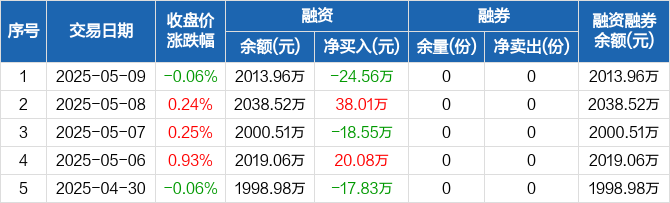 融资方面,当日融资买入127.91万元,融资偿还152.46万元,融资净偿还24.56万元。融券方面,融券卖出0份,融券偿还0份,融券余量0份,融券余额0元。融资融券余额合计2013.96万元。