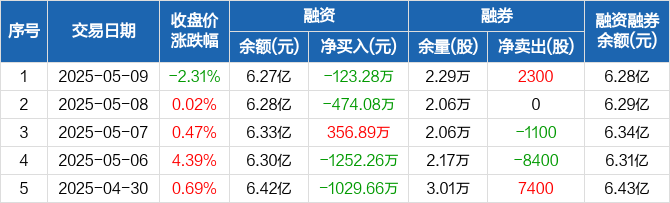 融资方面,当日融资买入2382.59万元,融资偿还2505.88万元,融资净偿还123.28万元。融券方面,融券卖出2300股,融券偿还0股,融券余量2.29万股,融券余额95.79万元。融资融券余额合计6.28亿元。