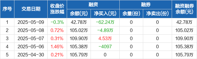 融资方面,当日融资买入4.03万元,融资偿还66.27万元,融资净偿还62.24万元。融券方面,融券卖出0份,融券偿还0份,融券余量0份,融券余额0元。融资融券余额合计42.78万元。