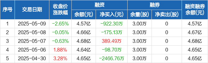融资方面,当日融资买入2170.65万元,融资偿还3092.95万元,融资净偿还922.3万元。融券方面,融券卖出0股,融券偿还0股,融券余量3万股,融券余额59.58万元。融资融券余额合计4.57亿元。