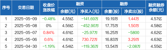 融资方面,当日融资买入517.94万元,融资偿还659.62万元,融资净偿还141.69万元,连续3日净偿还累计620.56万元。融券方面,融券卖出1.47万股,融券偿还300股,融券余量19.19万股,融券余额160.43万元。融资融券余额合计4.57亿元。