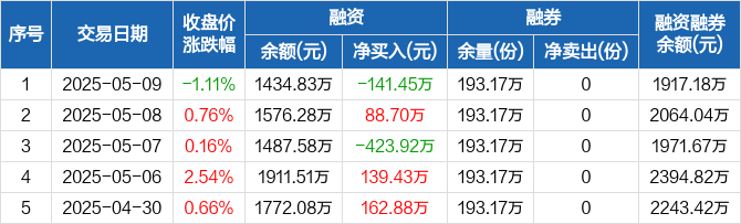 融资方面,当日融资买入142.93万元,融资偿还284.38万元,融资净偿还141.45万元。融券方面,融券卖出0份,融券偿还0份,融券余量193.17万份,融券余额482.35万元。融资融券余额合计1917.18万元。