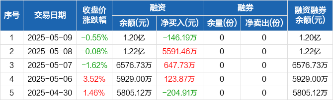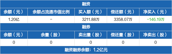 融资方面,当日融资买入3211.88万元,融资偿还3358.07万元,融资净偿还146.19万元。融券方面,融券卖出0份,融券偿还0份,融券余量0份,融券余额0元。融资融券余额合计1.2亿元。