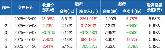 融资方面,当日融资买入2.08亿元,融资偿还1.74亿元,融资净买入3361.91万元。融券方面,融券卖出3.8万股,融券偿还200股,融券余量11.09万股,融券余额208.82万元。融资融券余额合计5.53亿元。