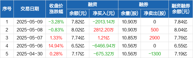融资方面,当日融资买入1.36亿元,融资偿还1.56亿元,融资净偿还2013.14万元。融券方面,融券卖出0股,融券偿还0股,融券余量10.9万股,融券余额215.17万元。融资融券余额合计7.84亿元。