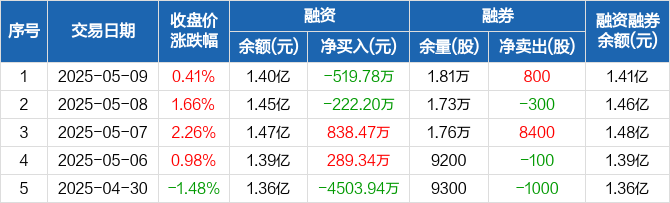 融资方面,当日融资买入1149.4万元,融资偿还1669.18万元,融资净偿还519.78万元。融券方面,融券卖出900股,融券偿还100股,融券余量1.81万股,融券余额97.74万元。融资融券余额合计1.41亿元。